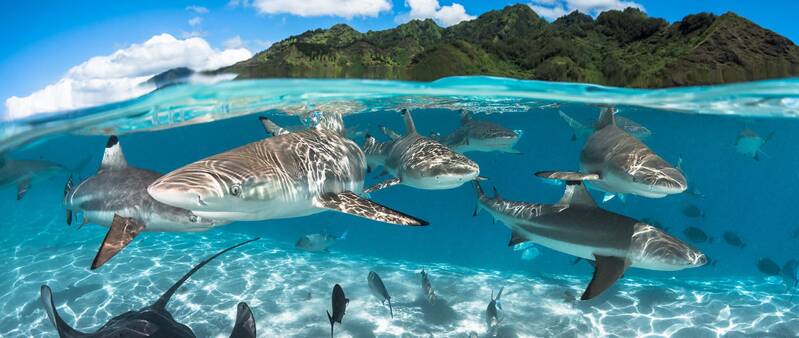 Haaien hebben een hele belangrijke rol in het gezond houden van de maritieme ecosystemen op aarde. Ze eten de zieke en zwakke vissen op en zorgen daardoor dat de riffen en oceanen sterk blijven. Hierboven zie je een groep zwartpunt rifhaaien, te herkennen aan de zwarte punten op hun vinnen.